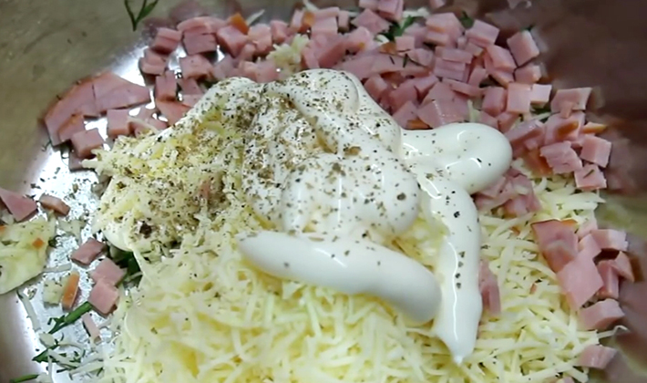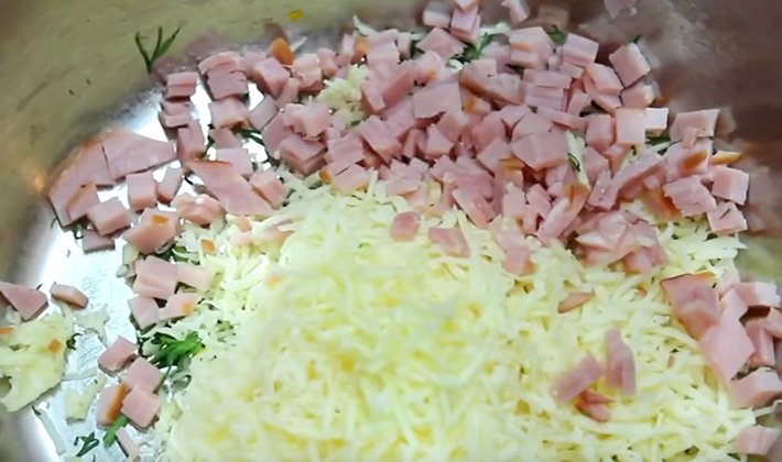 Le jambon et les oignons sont frits dans une casserole à l'huile de tournesol. À la fin, de l'aneth, de la crème sure, des épices et la moitié du fromage râpé sont ajoutés.