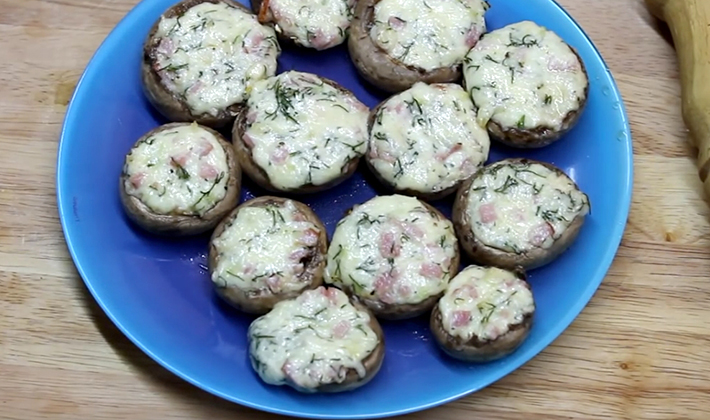 Ces champignons farcis au jambon sont cuits au four à une température de 200 degrés pendant environ 20-25 minutes.