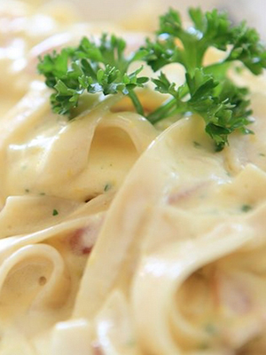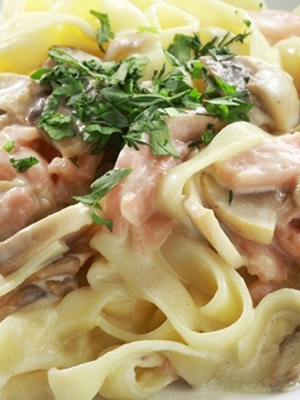 La recette suivante est idéale pour les pâtes à fettuccine. La cuisson prend environ 20 minutes. Pour la sauce, préparez 100 g de champignons et de jambon, 200 ml de crème épaisse, 1,5 c. l farine, 200 g de parmesan râpé. Pour commencer, une pâte est préparée - 400 g doivent être amenés à un état semi-prêt. Les champignons doivent être bouillis dans une petite quantité d’eau salée. La sauce est préparée comme suit: chauffée dans une casserole 2 c. l beurre, dans lequel la farine est frite, et tout est versé avec de la crème.
