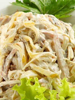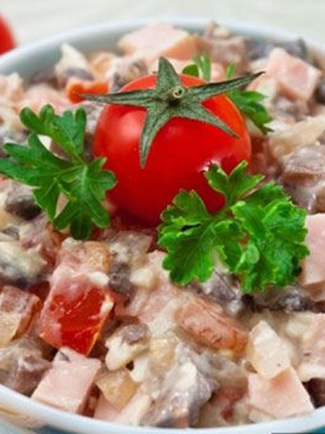 Salade avec langue de boeuf, jambon et champignons