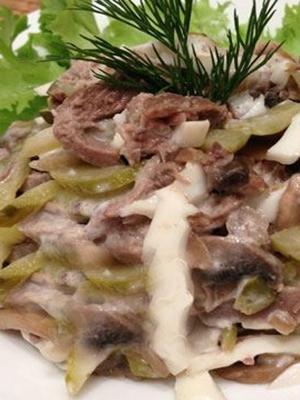 Cette salade à la langue de bœuf additionnée de jambon et de champignons est capable de décorer et de diversifier votre table de fête. Pour la cuisson, vous avez besoin de 300 g de trois produits principaux, 2 pcs. oignons, mayonnaise, sel et poivre - au goût. La cuisson et la préparation des principaux produits prendront environ 2 heures. La langue est nettoyée et bouillie dans de l'eau salée. Les champignons et les oignons sont coupés et frits dans de l'huile végétale jusqu'à ce qu'ils soient cuits.La langue et le jambon bouillis sont coupés en lanières et ajoutés aux champignons. Le tout est assaisonné de mayonnaise, de poivre et de sel. La salade prête décorée avec des verts est servie sur la table.