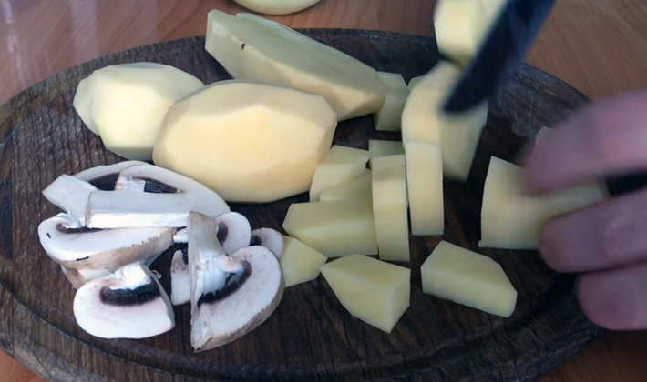 Pelez les pommes de terre, coupez-les en cubes, les champignons - en tranches, les oignons - en demi-anneaux.