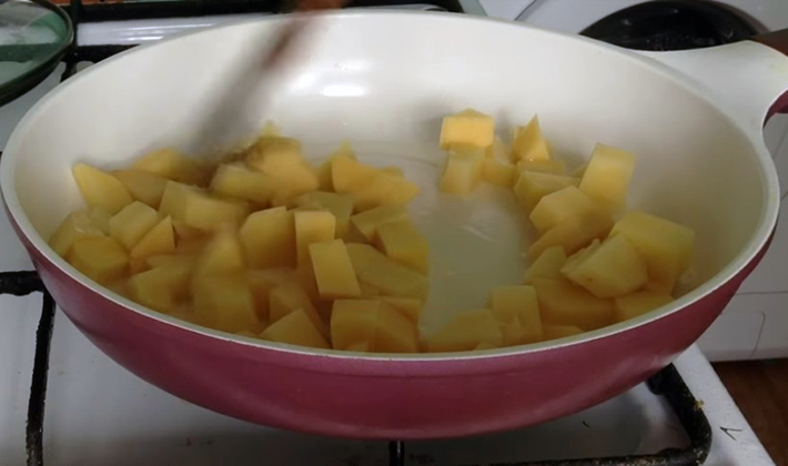Faire chauffer l'huile dans une poêle, faire frire les pommes de terre à feu doux jusqu'à ce qu'elles soient à moitié cuites.