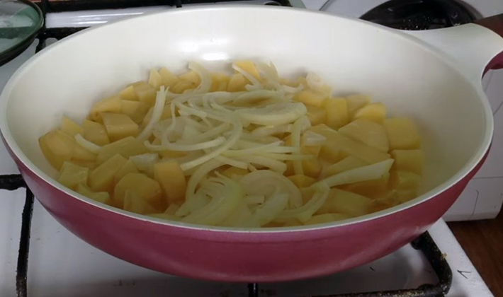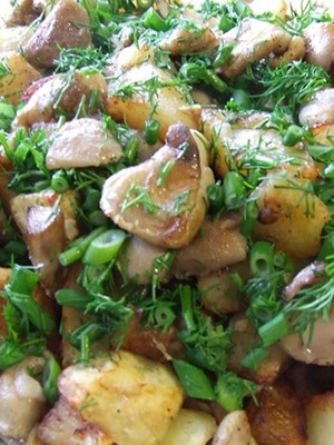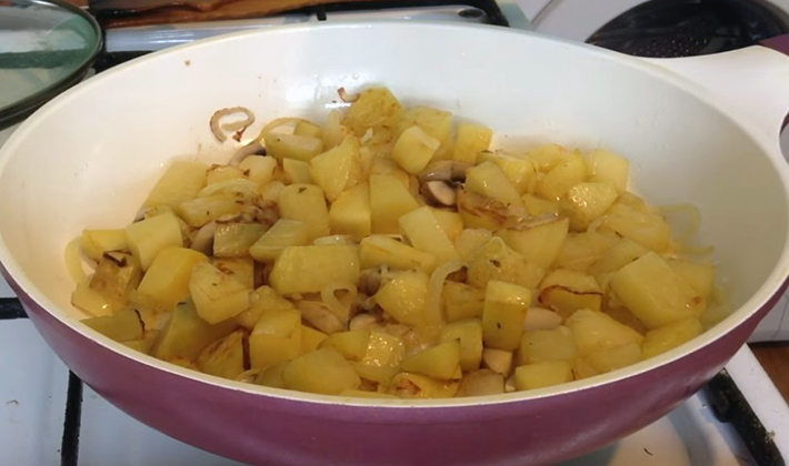 - Champignons cuits avec des oignons mélangés avec des pommes de terre, assaisonner avec du sel et des graines de carvi et faire frire pendant plusieurs minutes.