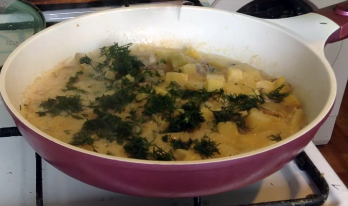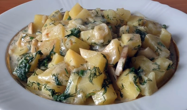 - Champignons frais cuits avec des pommes de terre à la crème sure: recette avec photo