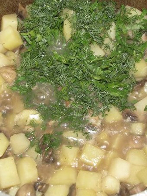 - Les champignons coupés en cubes, le bacon et les dés et le ragoût avec des oignons hachés, si désiré, ajouter un peu de bouillon.