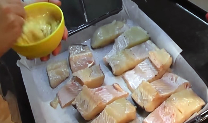- Saupoudrer le poisson râpé du poisson, verser sur le beurre fondu et mettre au four pendant 5 à 6 minutes pour le faire dorer.