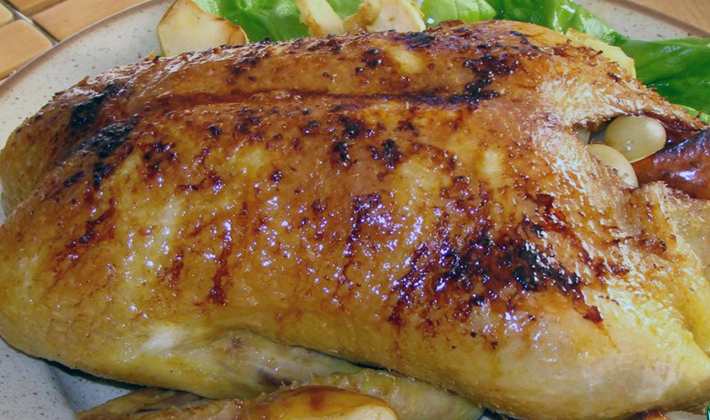 - Cuire le poulet farci aux champignons avec du fromage à 180 ° C pendant environ 1,5 heure, puis retirer de la manche ou déplier le papier d'aluminium et maintenir au four encore 30 minutes pour former une croûte dorée.