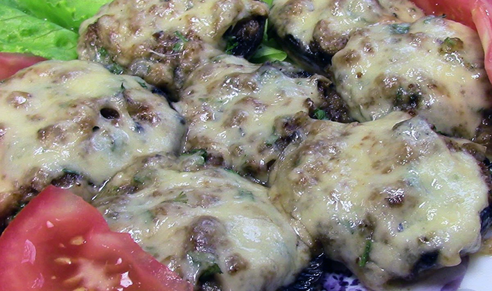 - Faire des champignons dans des chapeaux de champignons, les garnir de viande préparée, les mettre dans un bol en céramique graissé de beurre (20 g), verser le beurre fondu restant, saupoudrer de chapelure, de fromage râpé et cuire au four préchauffé à 180 ° C pendant 30 minutes .