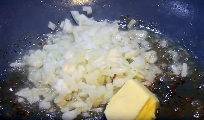 - Faites fondre le beurre dans une casserole et mettez la viande hachée avec les champignons et les oignons.