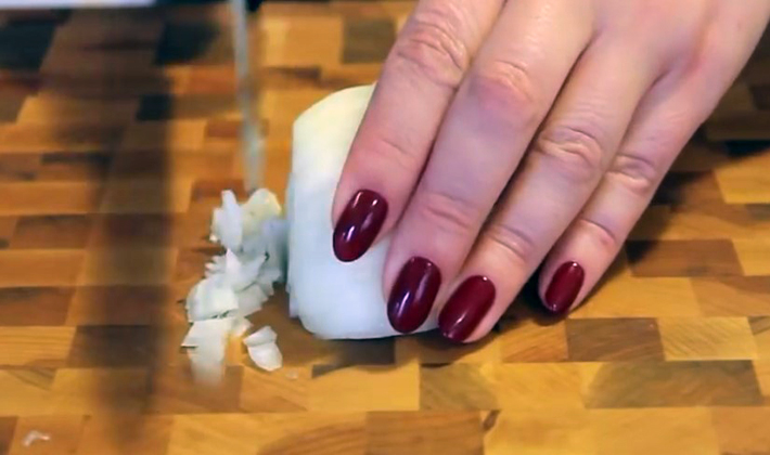 - Couper les cuisses et la chair finement avec un couteau, éplucher l'oignon et hacher également.