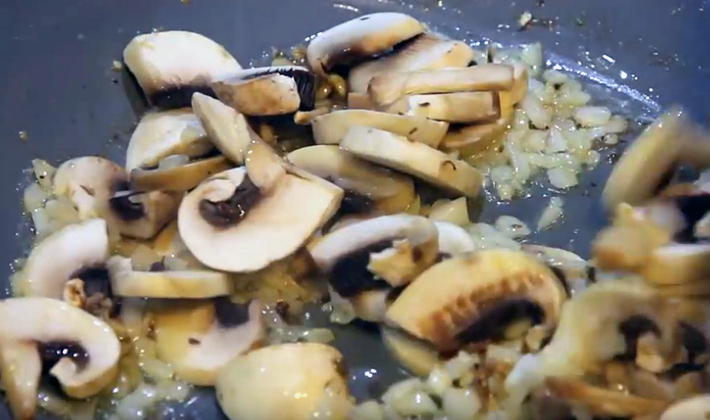 - Dans une casserole où la viande a été frite, mettre les champignons coupés en lanières et les faire frire pendant 10 minutes.