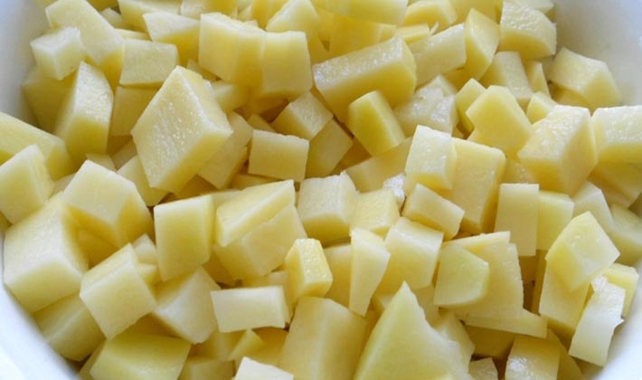 Pour cuisiner la soupe aux champignons au micro-ondes conformément à cette recette, vous devez laver les pommes de terre, les peler, les couper en petits cubes.