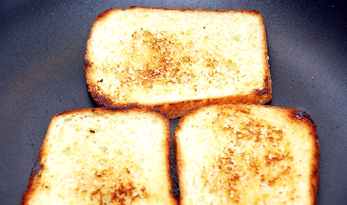 Le pain est légèrement frit au beurre.