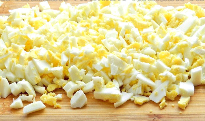 Les œufs durs et pelés, ainsi que les saucisses et les champignons, sont finement hachés.