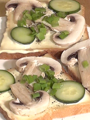 - Graisser les tranches de pain avec du beurre, y déposer les champignons tranchés et saupoudrer de fromage. Cuire au four à 100% pendant 1 minute.