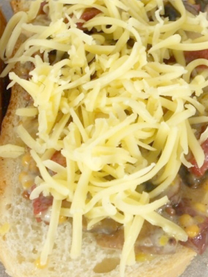 - Graisser les tranches de pain avec du beurre, du sel, mettre des tranches de saucisse, des champignons et des tomates, des tranches de bacon dessus, puis saupoudrer de fromage râpé et cuire à 100% pendant 1 minute.