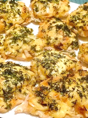 - Faire brunir le pain dans un grille-pain et badigeonner de fromage à la crème.