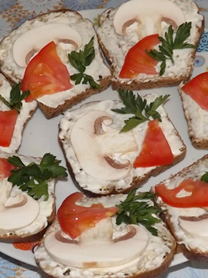 Trancher le pain. Râpez le fromage. Laver les tomates cerises, coupées en deux. Couper les champignons en tranches. Lavez l'aneth et le persil, séchez-les et coupez-les finement (mettez quelques branches pour la décoration). Les champignons passent dans un hachoir à viande, combinent avec du beurre et des herbes, du sel et du poivre.