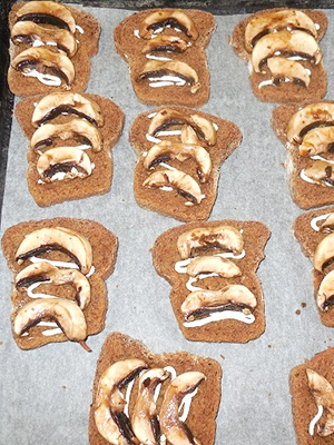 La masse préparée est étalée sur du pain, les sandwichs sont décorés de maïs et de pois.