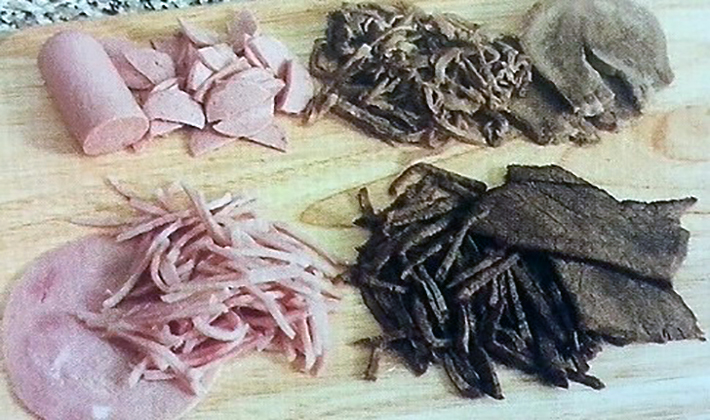 - 100 g de jambon, langue bouillie, champignons en conserve
