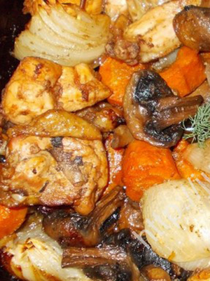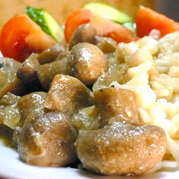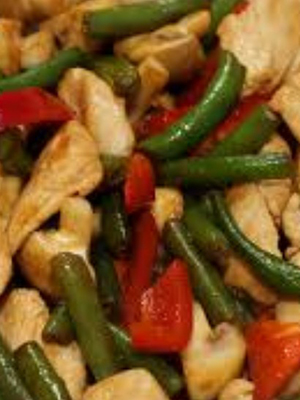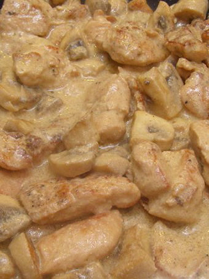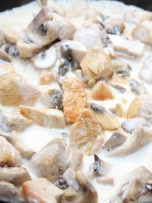 - Champignons préparés et pelés, coupés en cubes, filet de poulet en fines lanières.