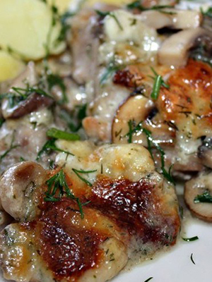 Cette recette pour les champignons à la crème et au fromage implique l'ajout d'un autre ingrédient - la viande. Un festin cuit dans une casserole est copieux et vous met l'eau à la bouche, et ne nécessite pas non plus d'accompagnement.