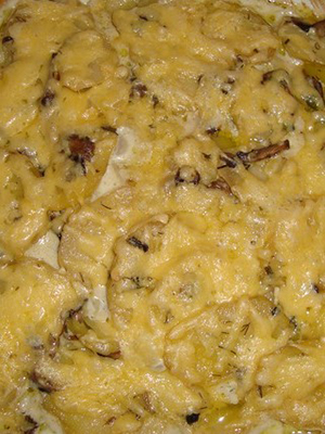 - La crème est mélangée avec du fromage demi-râpé, versé sur la surface du futur plat.