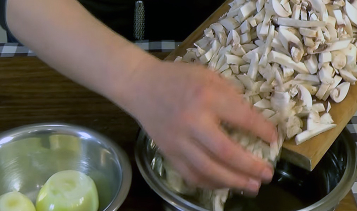 - Ajouter les champignons, mélanger et faire frire à feu minimum pendant 10 minutes.