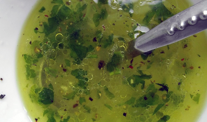 Dans un petit bol, mélanger l’huile d’olive, l’ail pilé, le sel et le romarin, et battre au fouet (pour plus de simplicité, ajoutez une pincée de piment rouge).