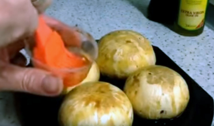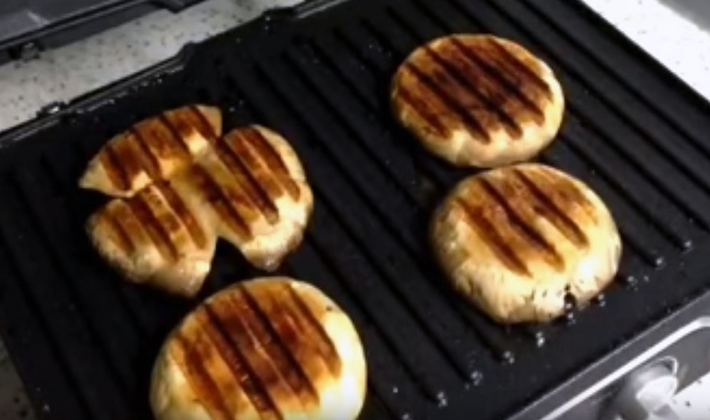 - Les champignons sont disposés dans un moule graissé au beurre et cuits au micro-ondes en mode “Grill” pendant 5 minutes.