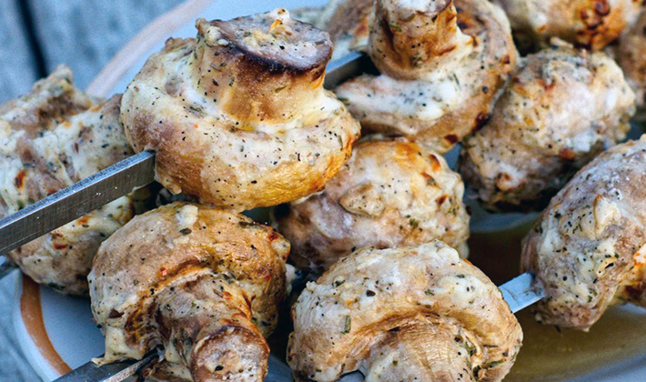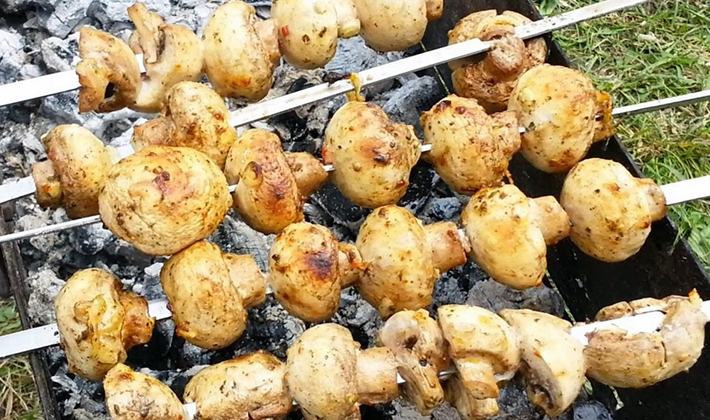 - Enfilez les champignons en alternant avec les légumes, mettez les au grill et faites cuire pendant 20-25 minutes.