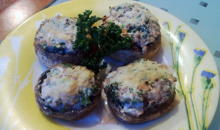 - Mettre les feuilles de laitue sur un plat, puis étendre les chapeaux avec la garniture et servir.