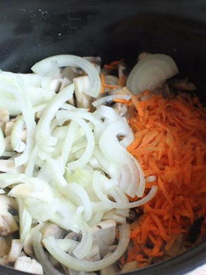 - Les champignons coupés sont introduits, frits pendant 10 minutes. avec le couvercle du multicuiseur ouvert (s'il y a peu d'huile végétale dans le bol, ajoutez-en un peu).