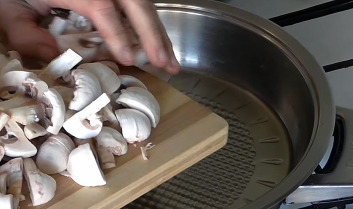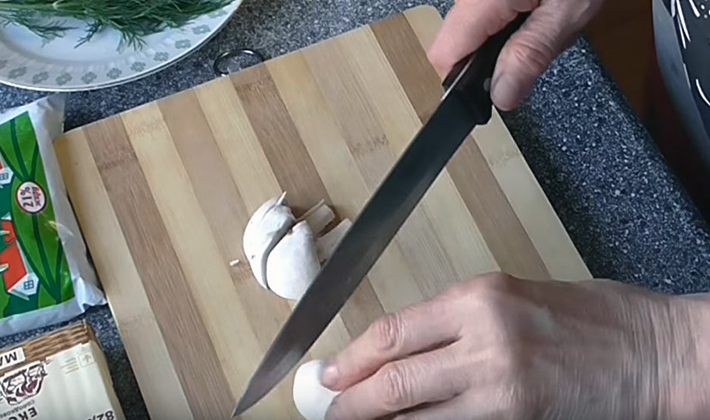 - Pelez les champignons du film, coupez-les en morceaux de forme arbitraire.