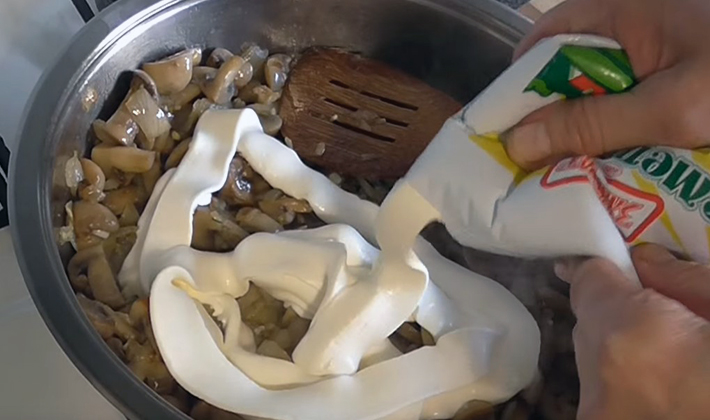 - Mettez les champignons, versez la crème sure et ajoutez l'ail écrasé, mélangez.