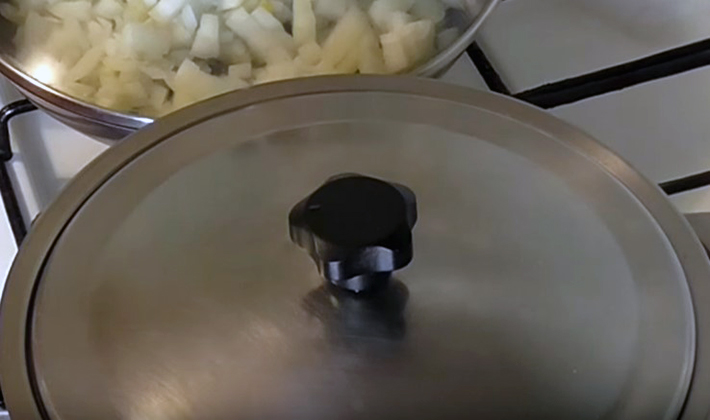 - Épluchez l'oignon, lavez-le, coupez-le en cubes et faites-le frire dans une petite quantité d'huile pendant 10 minutes.