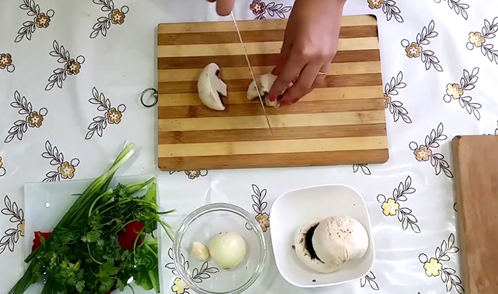 - Épluchez les aubergines, coupez les en fines tranches et salez. Faire bouillir les champignons et les hacher.