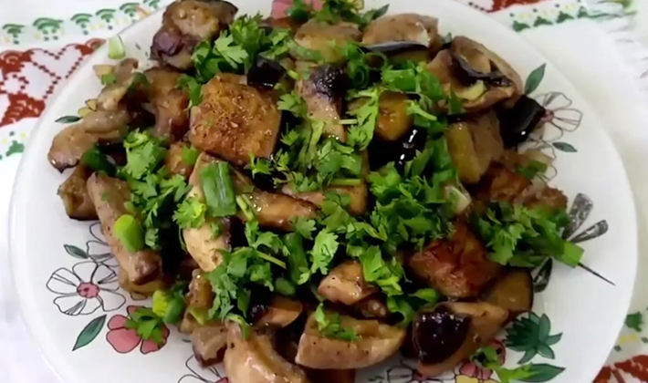 - Lorsque les champignons donnent du jus, un délicieux plat d'aubergines aux champignons peut être servi.