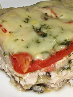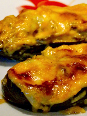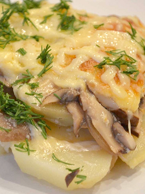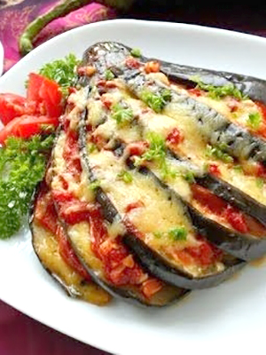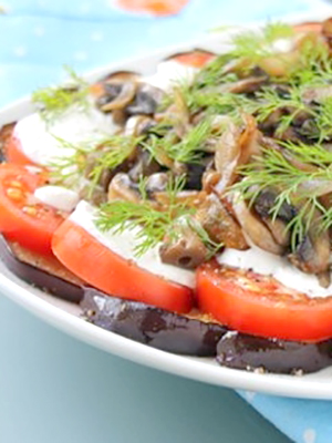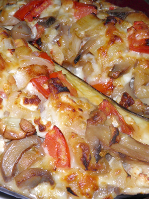 - Aubergine avec champignons, tomates, crème sure et fromage