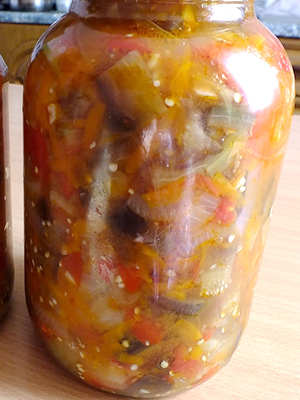 Aubergines aux champignons préparées pour l’hiver, les mettre dans des pots stérilisés, les tourner et les recouvrir d’une couverture.