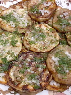 - Graisser une plaque à pâtisserie avec de l’huile végétale, y déposer les aubergines. Cuire au four préchauffé à 200 ° C pendant 15 minutes.