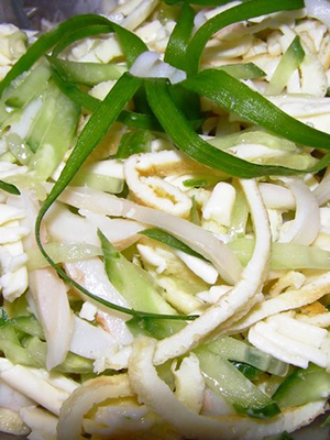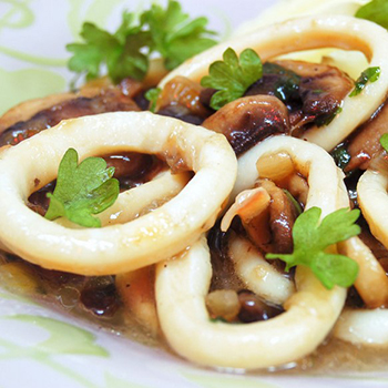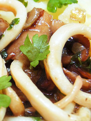 - Salade tiède avec calamars, champignons, céleri et oignons, quand servi, saupoudrer de persil.