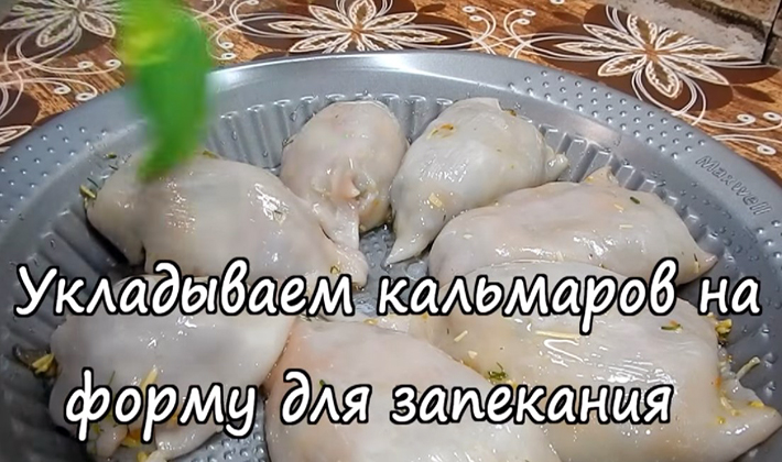 - Rincez les calamars, remplissez-les du mélange préparé, mettez-les en profondeur, versez-y un peu d'eau, ajoutez de la mayonnaise. Mettez au four préchauffé à 20 ° C pendant 7 minutes.