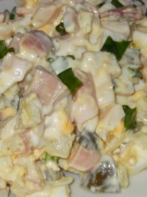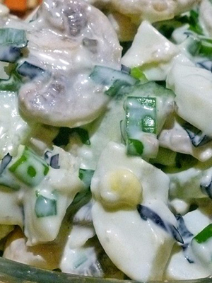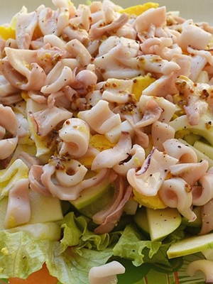 - Salade de calamars, champignons, carottes, œufs et petits pois