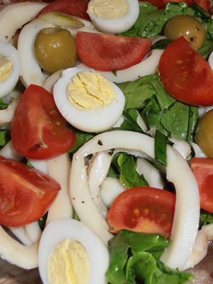 - Une salade simple avec calamars, champignons, fromage, œufs et oignons