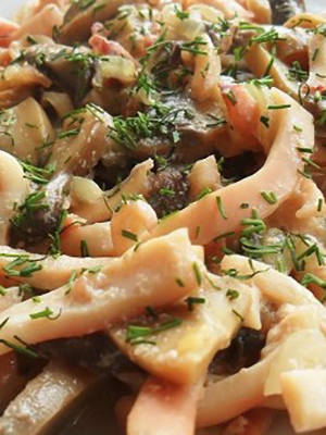 - Calmars aux champignons, oignons et céleri à la crème sure