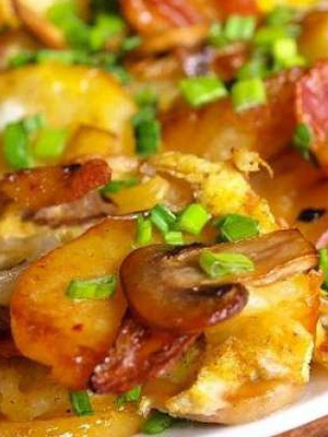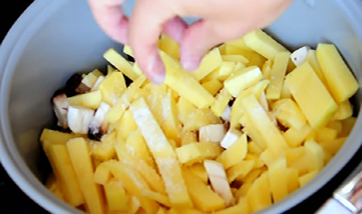 - Ajouter les champignons, faire frire 10 minutes. en remuant constamment et introduire des cubes de pommes de terre.