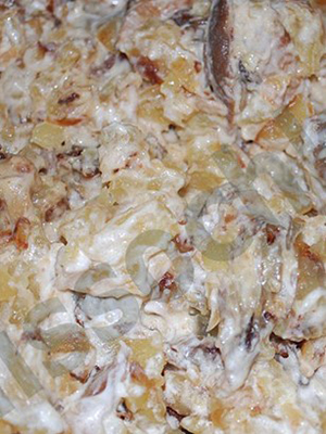 - Ajoutez des cubes de pomme de terre aux champignons et aux oignons, versez la crème et un peu d'eau bouillie tiède (vous ne pouvez pas ajouter d'eau).
