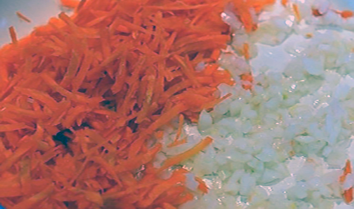 Les carottes et les oignons sont pelés, lavés et coupés: carottes à fines lanières, oignons en cubes.